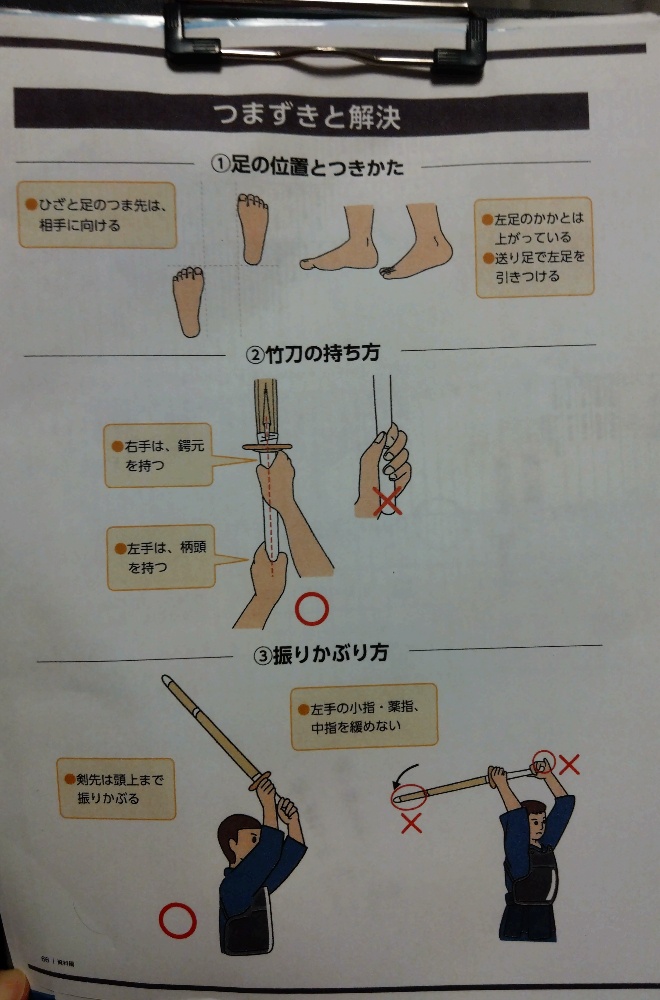 今日の初心者稽古では、足の位置とつきかた、竹刀の持ち方、振り被り方を図を見ながらポイントにわけてお父さん、お母さんと一緒にやりました。